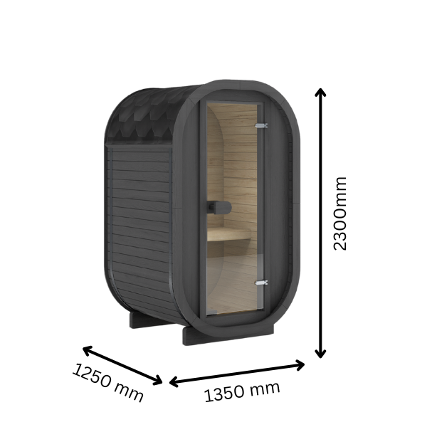 Badstuen måler 1,35 x 1,25 meter og har en høyde på 2,3 meter – ideell der plassen er begrenset, men velværen skal prioriteres.