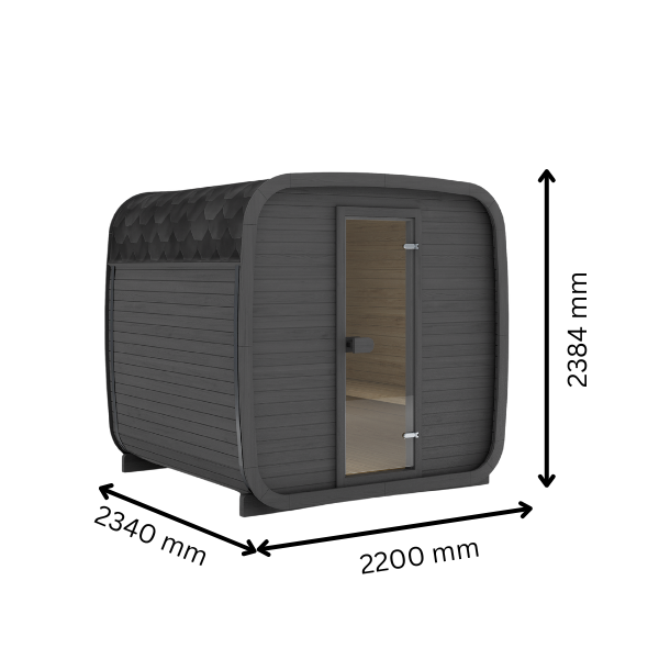 Ula S er en moderne og stilren utendørs badstue designet for opptil 6 personer. Kube form og kompakte mål på 2,20 x 2,34 meter (høyde 2,38 m), passer den perfekt i både hager og ved hytter – selv der plassen er begrenset. Badstuen er produsert i førsteklasses naturlig treverk og kommer med et slitesterkt, værbestandig tak og minimalistisk herdet glassdør for et moderne uttrykk.