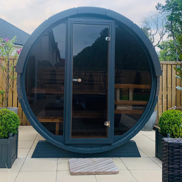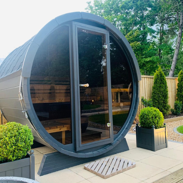 Denne badstutønnen kombinerer praktisk design med moderne komfort, og er ideell for mindre uteområder eller hytter.